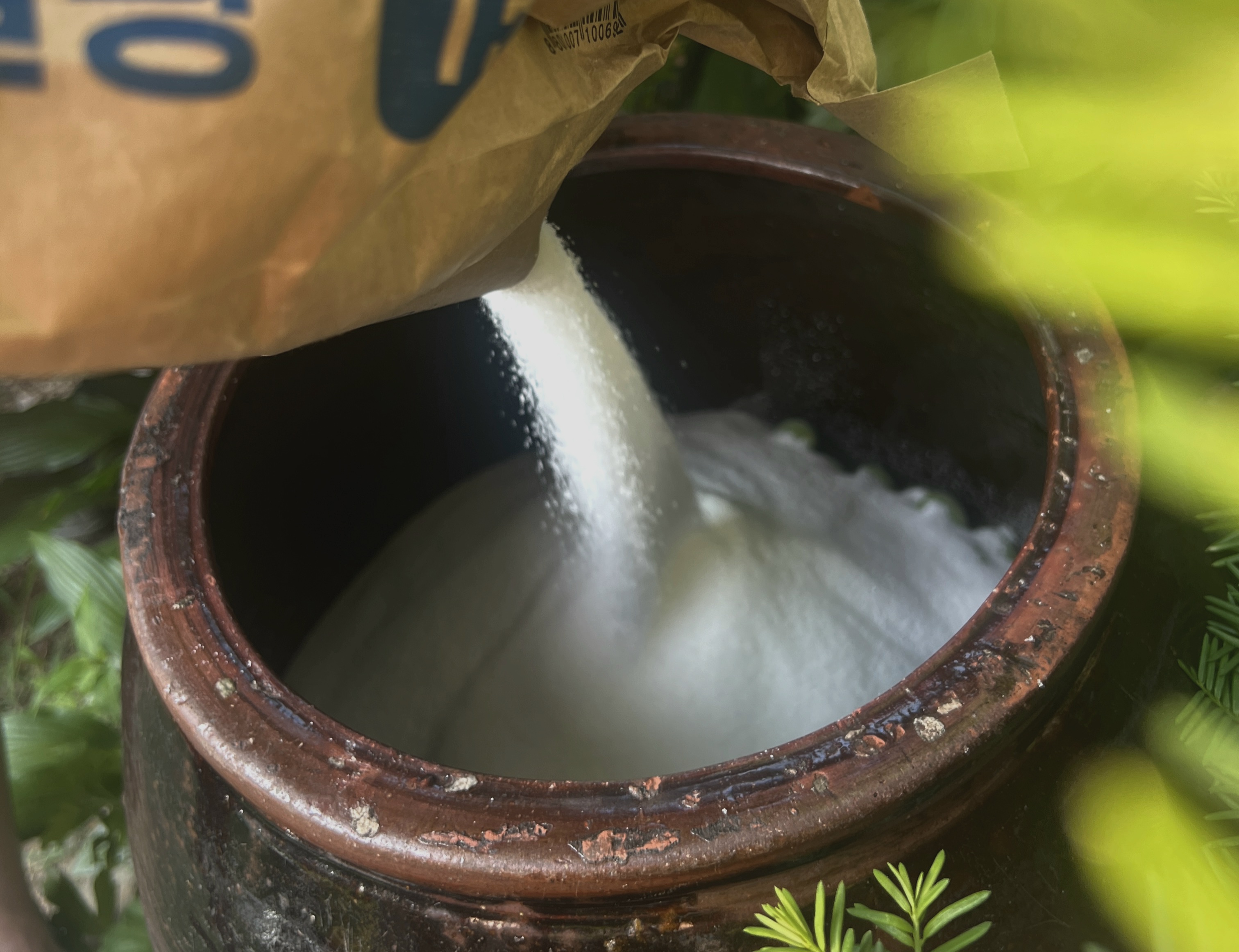 - 모든 매실과 설탕을 유리병이나 항아리에 넣은 후 유리병의 뚜껑을 꽉 닫거나 항아리의 입구에 일회용 비닐봉지로 덮고 고무줄로 고정하여 밀봉합니다.
